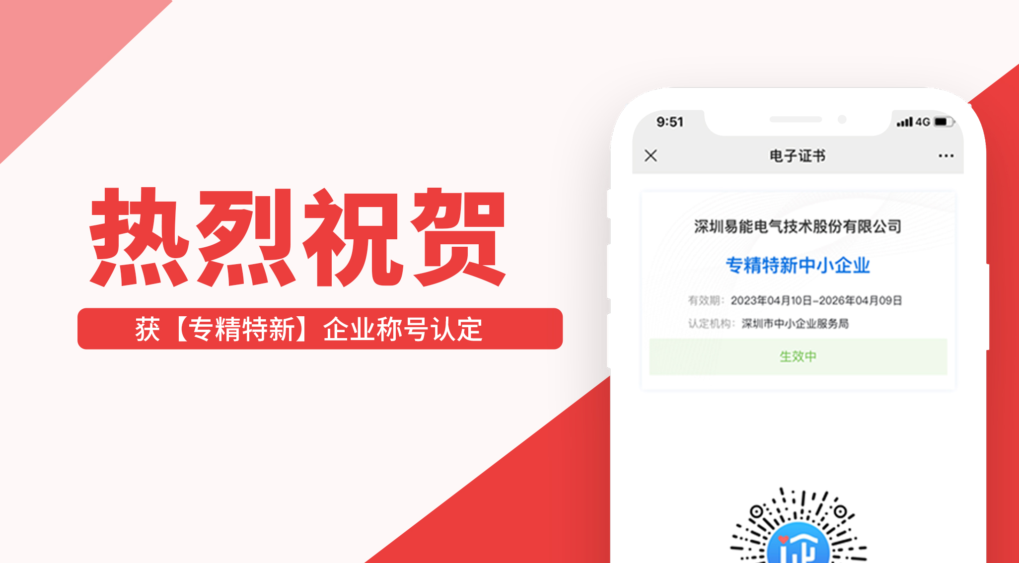 據(jù)深圳市“專精特新”中小企業(yè)名單公示,易能電氣憑借專業(yè)技術(shù)水平,創(chuàng)新能力等綜合實(shí)力成功獲評(píng)深圳市“專精特新”中小企業(yè)稱號(hào)。